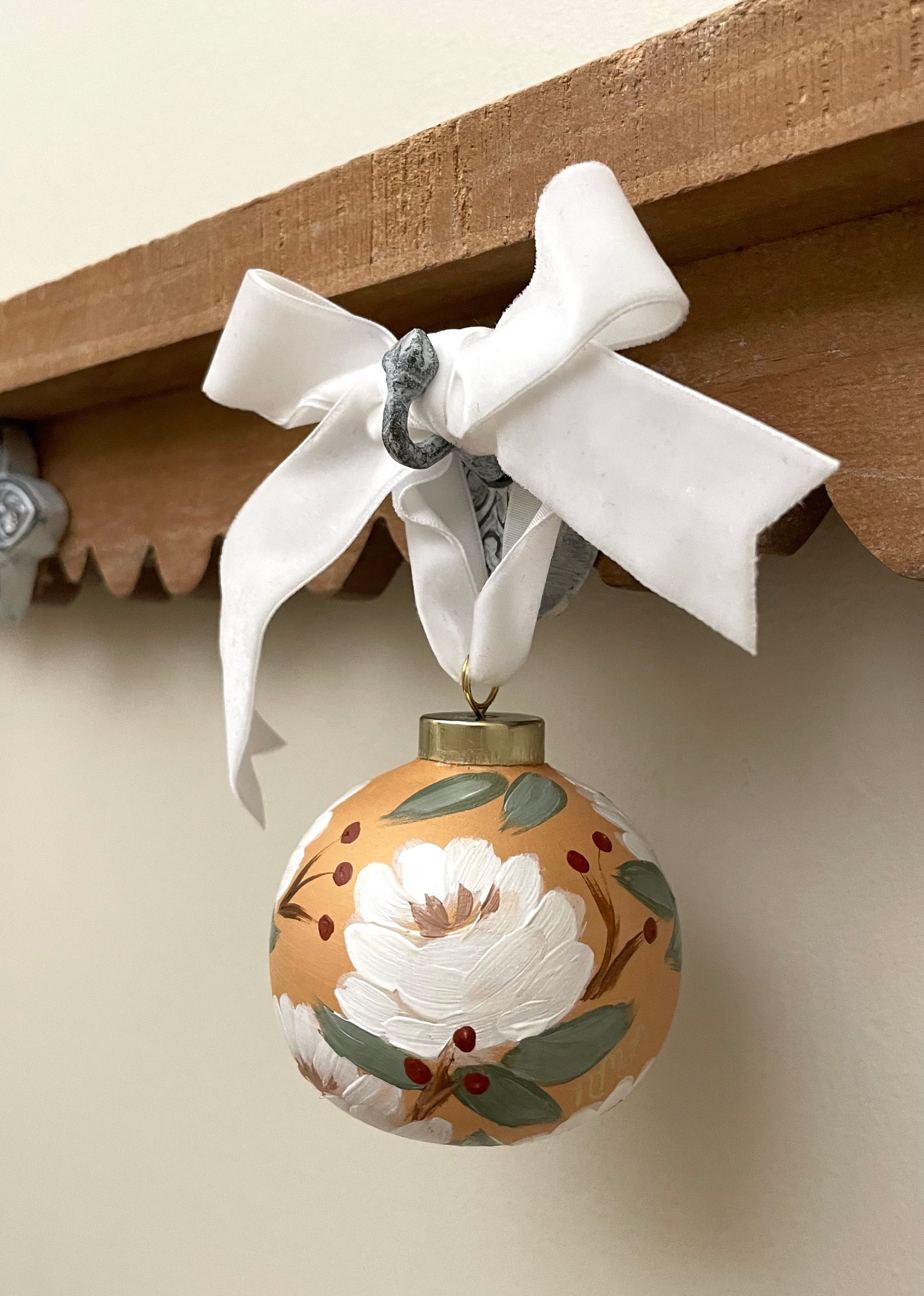 Deck the halls with original hand painted Christmas Ornaments by artist, Nicole May Lesher. Each ornament is beautifully designed with fun florals, a metallic gold topper, and a soft velvet ribbon.